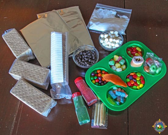 We added icing with green sugar sprinkles to one campsite to give it the look of grass. The other campsite had icing smeared on the foil to give it the look of snow on the ground.
